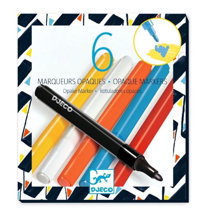 6 dækkende tusser i farverne sort, gul, hvid, orange, blå og rød.
