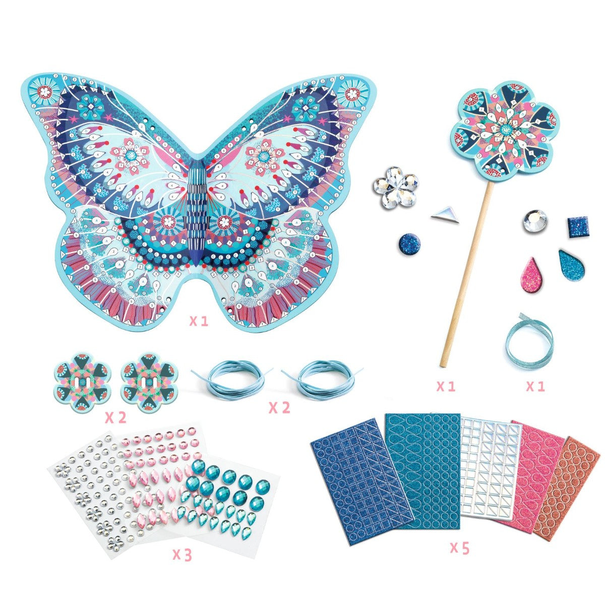 1 par illustrerede vinger i solidt karton, 2 elastiske stropper, 1 tryllestav, 5 ark med glitrende mosaikklistermærker, 3 ark med "ædelstens"-klistermærker, 1 vejledning.