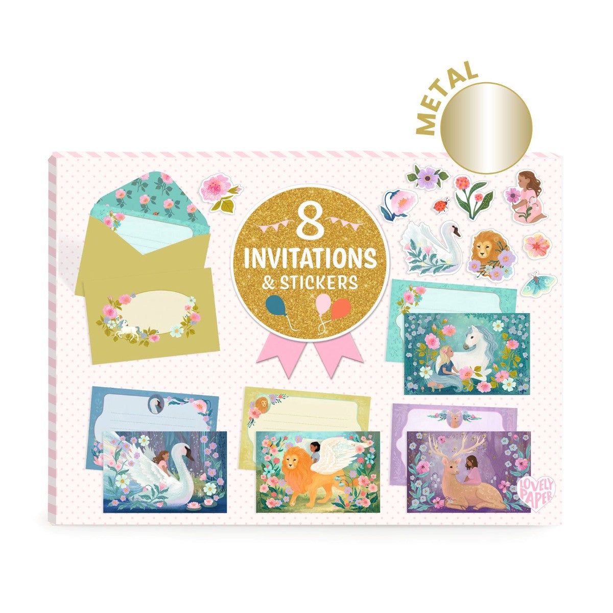 Skab en verden af magi og fantasi med dette eventyrlige invitationssæt med fantasydyr-tema! Sættet indeholder 8 smukt illustrerede invitationskort, 8 matchende kuverter og 2 klistermærkeark, der gør det nemt for børn at lave deres egne, personlige beskeder. De metalliske detaljer og mat tryk giver en elegant og original finish, som gør hver invitation uforglemmelig.