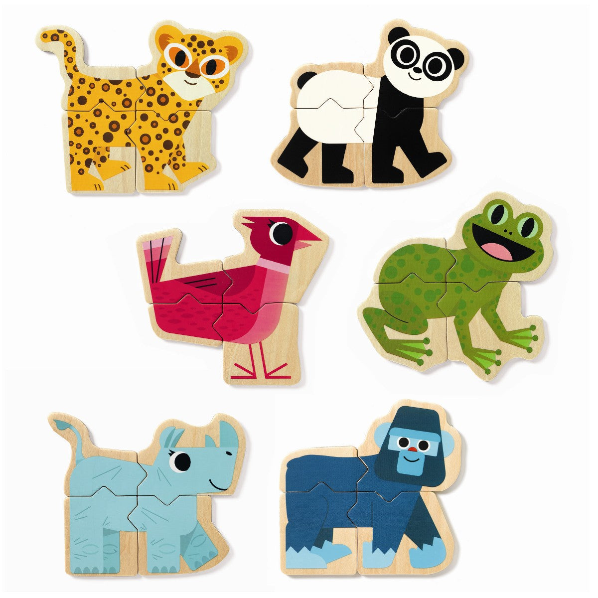 Et dyr består af 4 brikker. Der er seks forskellige dyr i æsken. Men brikkerne passer også sammen på kryds og tværs, så du kan skabe dine helt egne nye, tossede dyr.