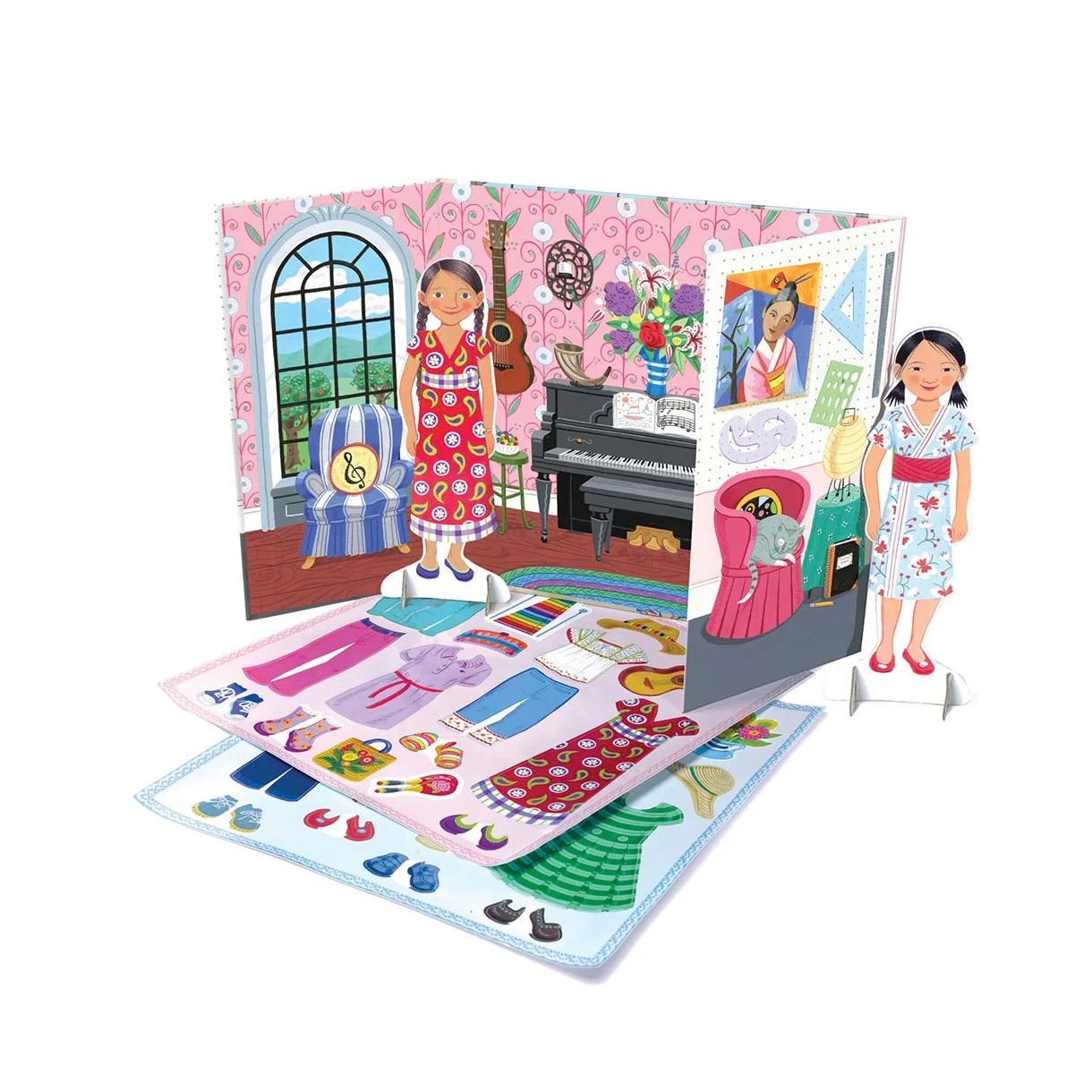 I dette fine sæt påklædningsdukker finder man Elodie og Naomi. 2 piger, som er vilde med kunst og musik.