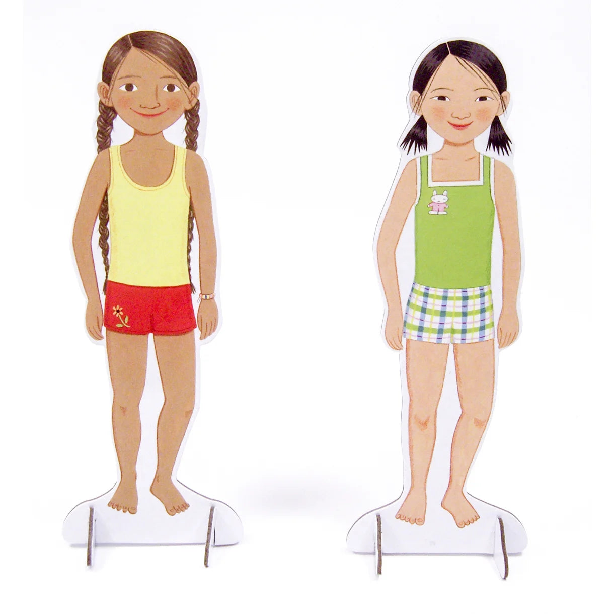 Hver påklædningsdukke er cirka 20 cm høj inklusiv stativ og der medfølger en dobbeltsidet baggrund og 2 ark vinyltøj, der kan tages af og på utallige gange.