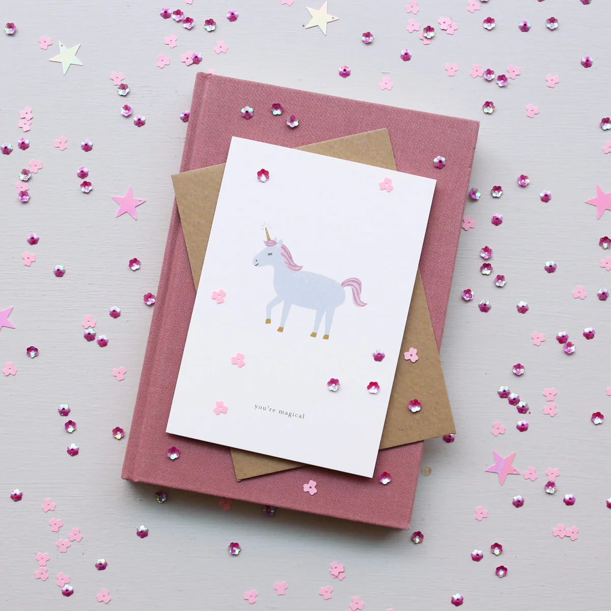 Gør en kær ven glad med dette simple, smukt illustrerede kort med en enhjørning og teksten: you're magical.