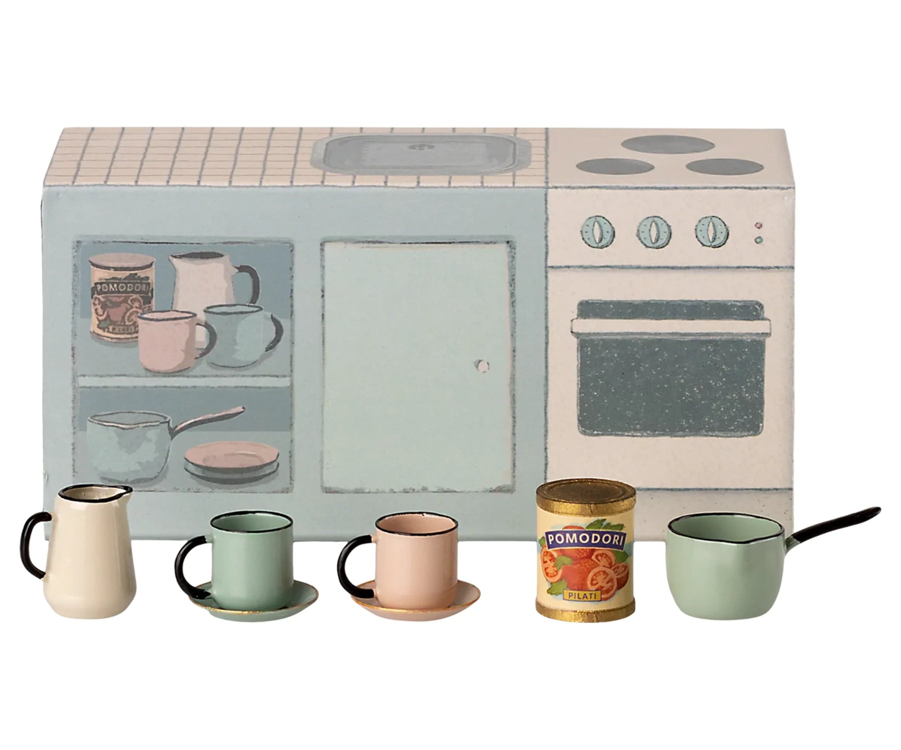 Køkkenbordet kommer med 2 kopper og 2 tallerkener, en gryde, en kande og en lille dåse.