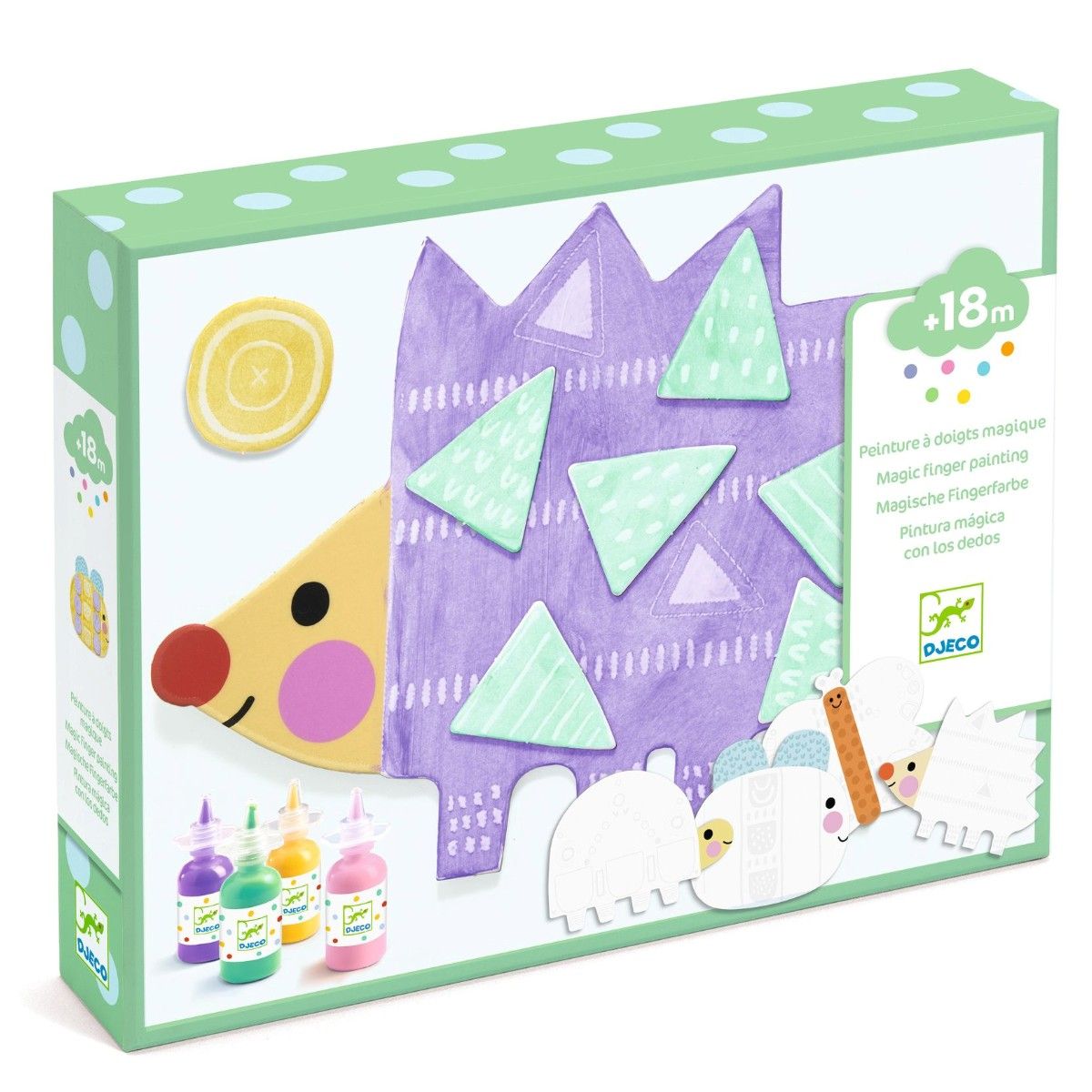 Med blot et par dråber maling kan børn farvelægge dyrene med deres fingre. Små mønstre dukker op som ved magi! Derefter kan de placere klistermærker for at gøre dyrene endnu sødere.