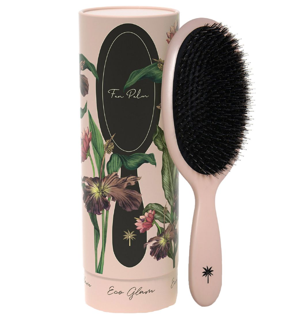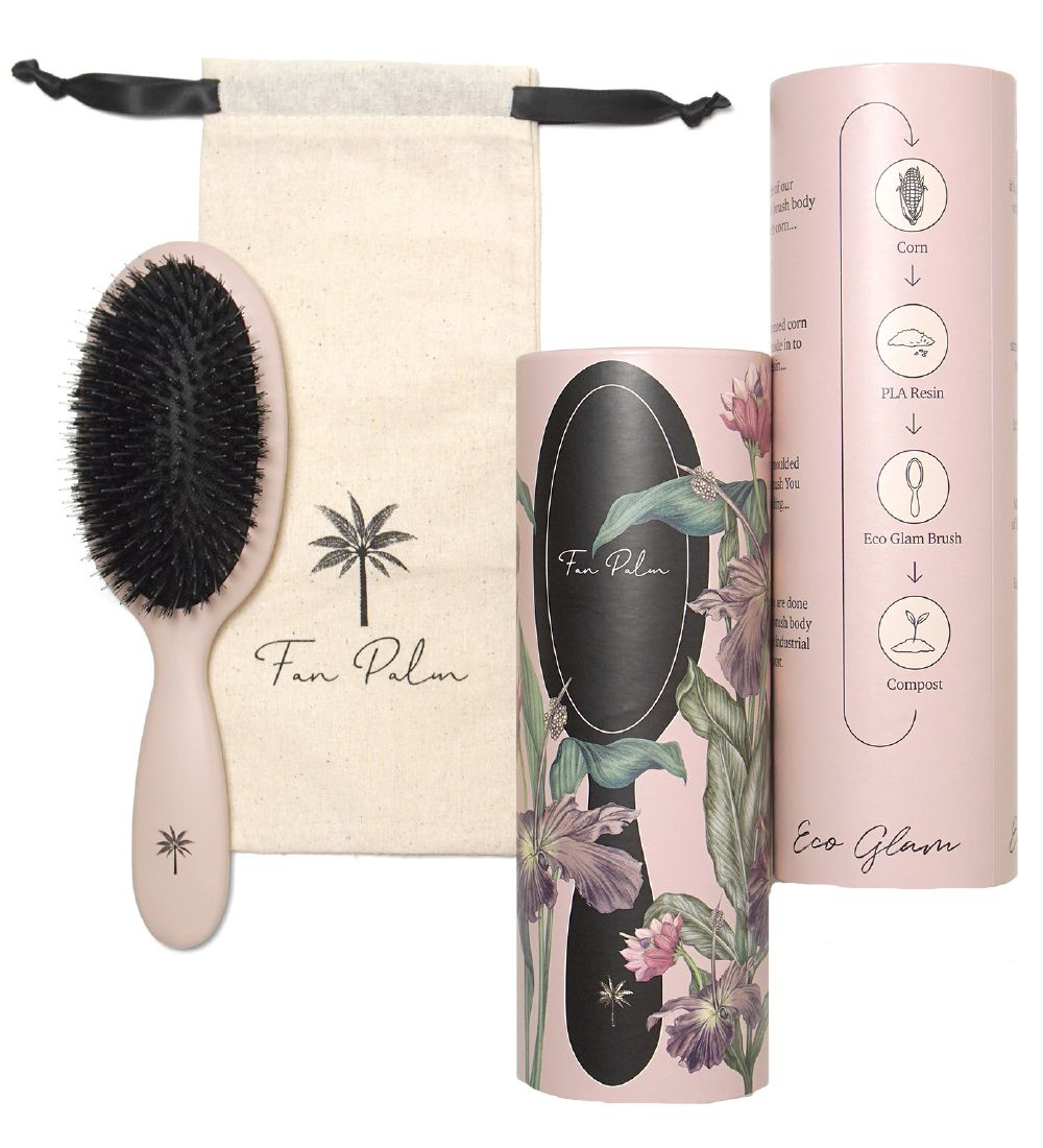 Fan Palm børsten har bløde og skånsomme vildsvinehår samt længere nylon børster, for at stimulere hovedbunden og hjælpe mod filtret hår, hvor de kortere vildsvinehår hjælper med at distribuere de naturlige olier i håret. Håndtaget er lavet i en biologisk nedbrydelig kvalitet af majs.