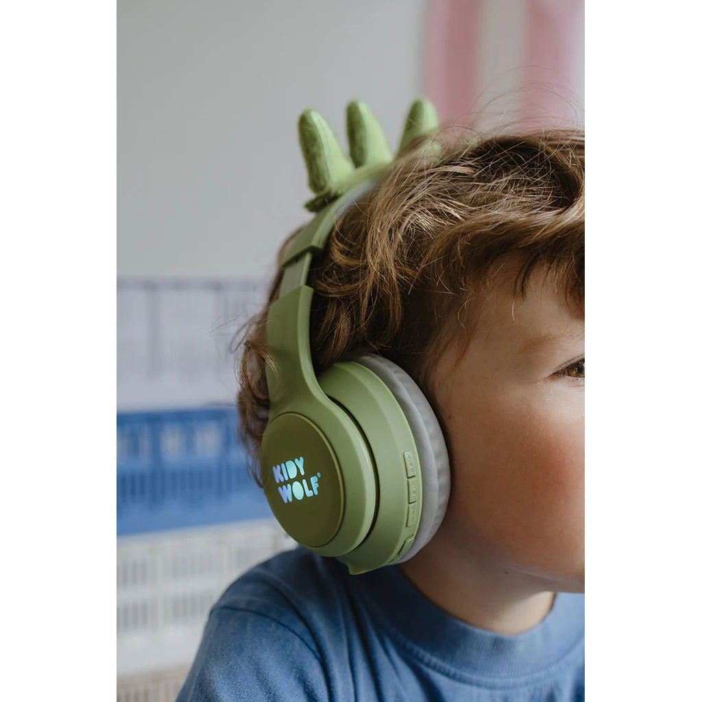 KIDYEARS Dino er det ultimative headset til små dinosaurfans! De magnetiske dinoører kan tages af og på for et sjovt og personligt look. Headsettet har en sikker lydbegrænsning på 85 dB og kan bruges både via Bluetooth og kabel.