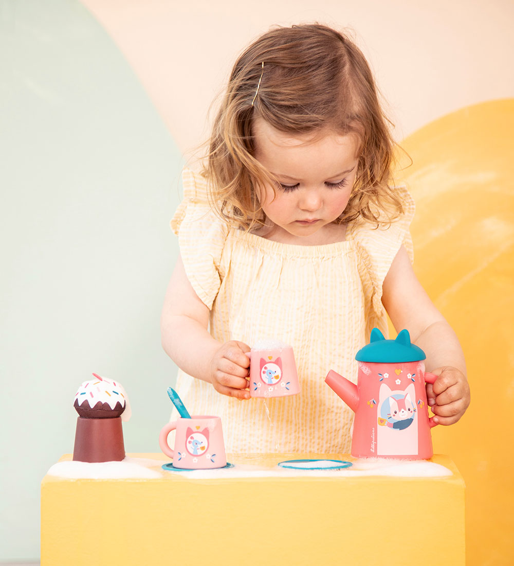 Fint Lilliputiens badelegetøj bestående af ni dele med print af katten Jeanne og små mus. Badelegetøjet er i rosa, blå og brune farver og består af en tekande, kopper, underkopper, en ske og en kage. Perfekt til fantasifuld leg i badet.
