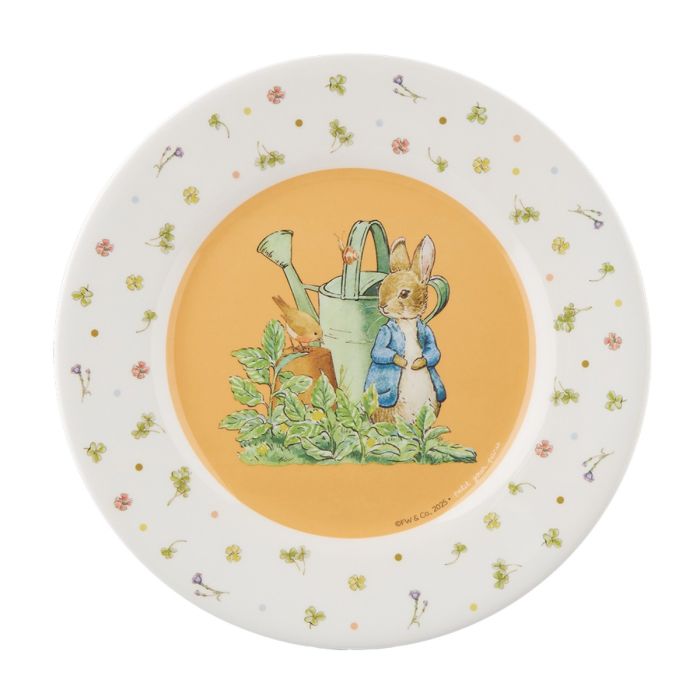 Fin tallerken fra Petit Jour med motiver fra Peter Kanins fine fortællinger - med orange kant.