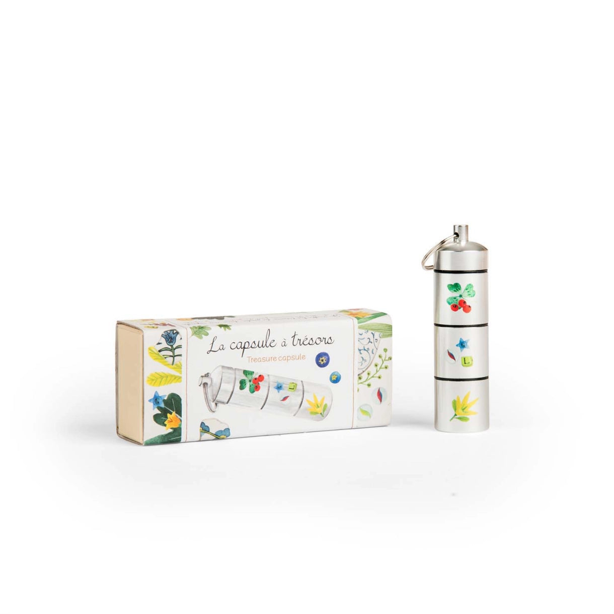 Denne specielle kapsel med 3-rum er perfekt til at indsamle alle de små naturskatte, når man er på udendørs eventyr. Tag den med overalt ved at fastgøre den lille karabinhage til tøj eller rygsæk.