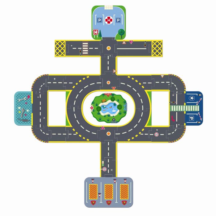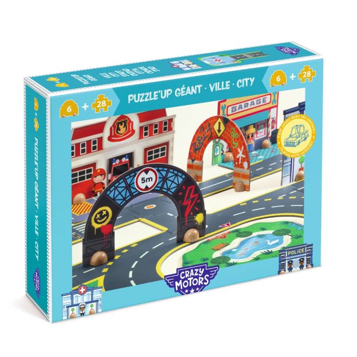 Byg en kæmpestor Crazy City med 27 gulvbrikker og 6 lodrette brikker, inklusive et hospital, en politistation, et værksted, en brandstation og to buer. Børn kan samle byen efter de medfølgende skabeloner eller slippe fantasien løs og skabe deres egne historier.