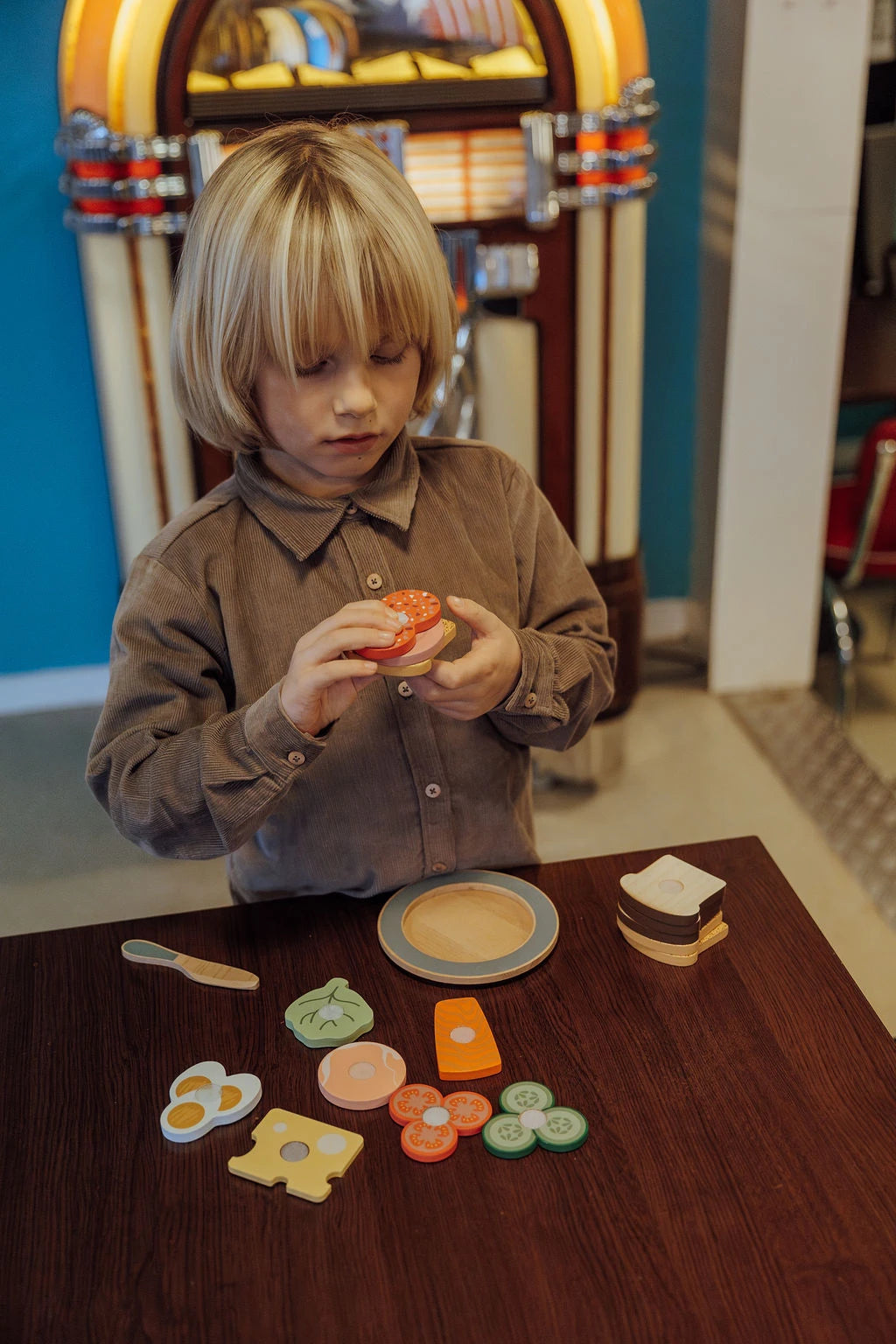 Sjov trælegetøj fra Mamamemo! Forskellige dele, så dit barn kan sammensætte madder og sandwiches, præcis som de kan lide dem.