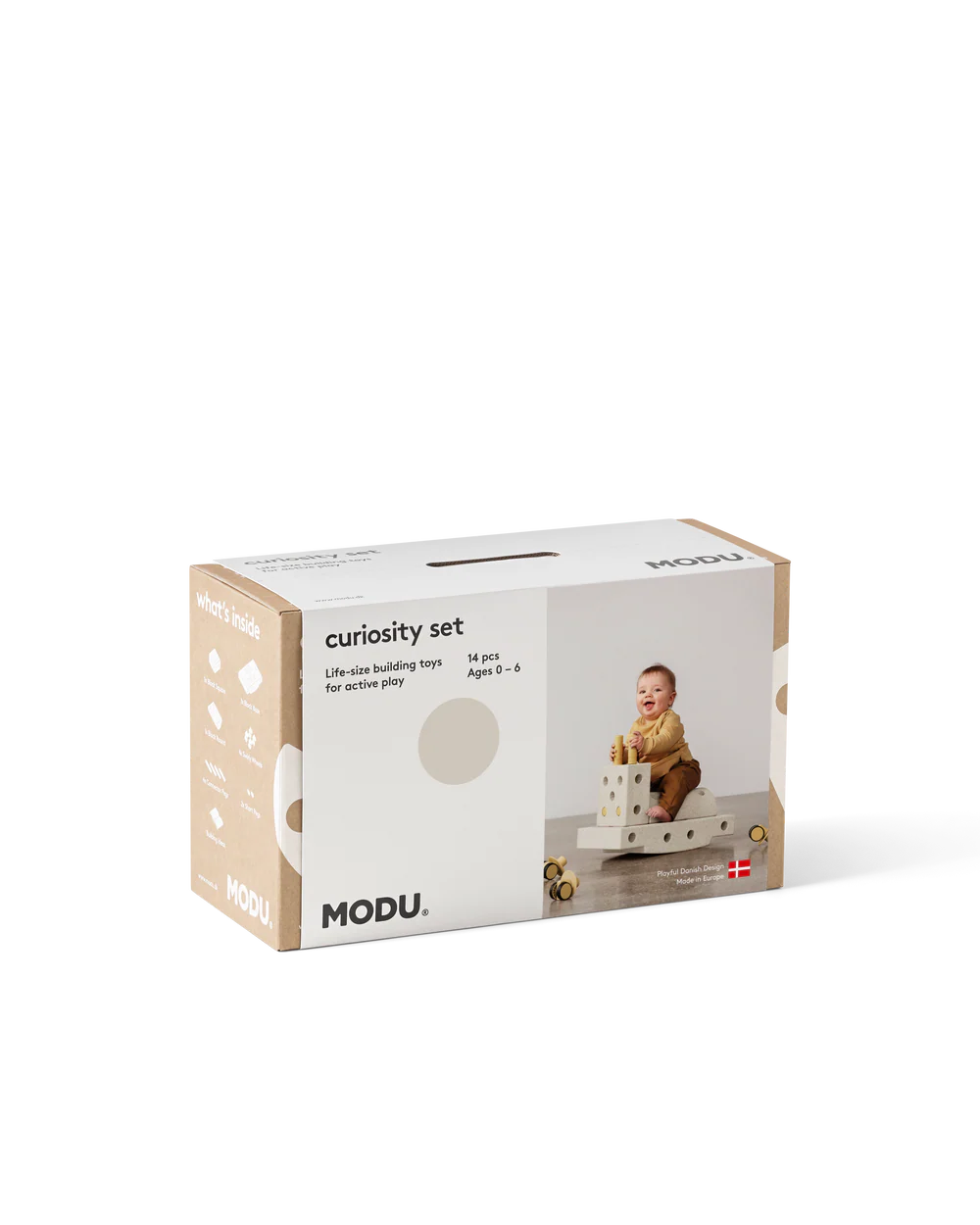 Er du nysgerrig på hvad MODU kan? Med Curiosity-sættet får du en simpel introduktion til MODUs univers. Kom godt fra start med din baby eller tumling og styrk de basale motoriske færdigheder. Byg et rullebræt til mavetid, en gyngehest til balancetræning, eller nyd lyden af rungende latter, mens du skubber dit barn rundt om spisebordet på et køretøj. Et funktionelt og pladsbesparende legetøj til det lille legehjørne i stuen. Tilføj nye klodser og udvid legen gradvist, som dit barn vokser — det er indbegrebet af MODU!